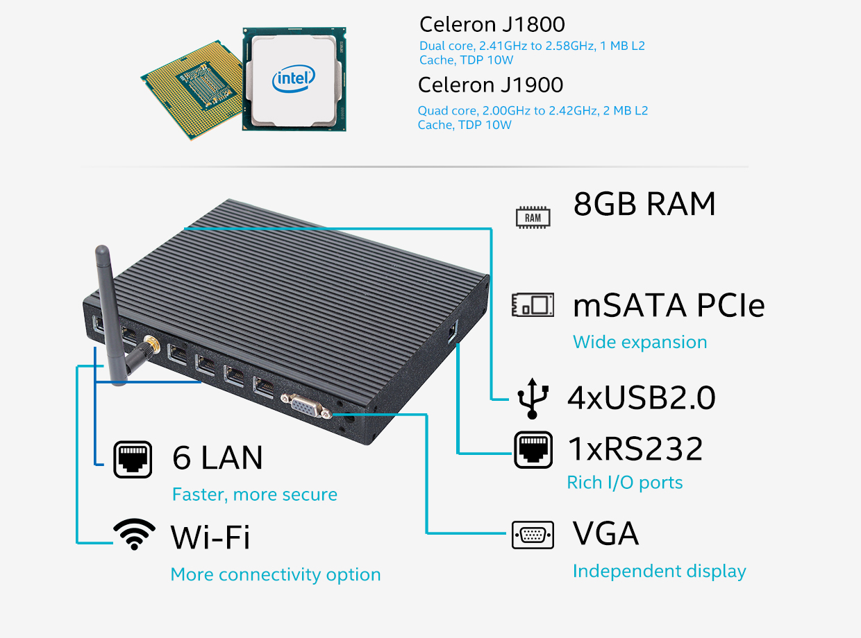 Developed around low power Bay Trail Platform Celeron J1900 and Celeron J1800