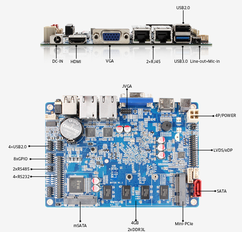 Measuring only 146mm x 102mm(LxW), this embedded board features rich I/O, including 1×HDMI, 1×VGA, 1×eDP/LVDS (optional), 1×Audio, 2×10M/100M/1000M BASE-T gigabit LAN(Intel i211), 1×USB3.0, 5×USB2.0, 4×RS232, 2×RS485, 1×LPC (optional), 8×GPIO. A whole heatsink will be attached to the bottom of the board for better cooling performance.