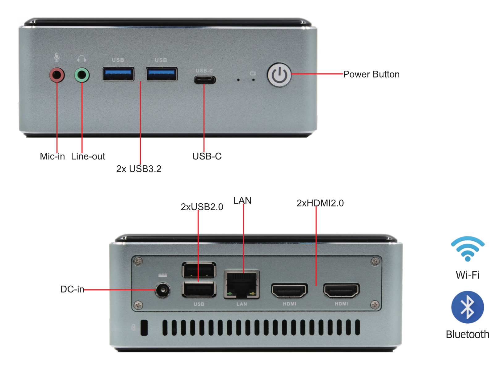 I/O Ports: 2xUSB3.2, 2xUSB2.0, 1xLAN, 2xHDMI, USB-C Gen2, Line-out, Mic-in