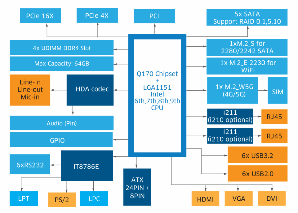 强大性能:支持Intel 6th至9th代处理器,搭载Q170芯片组,为您带来卓越的计算和数据处理能力。